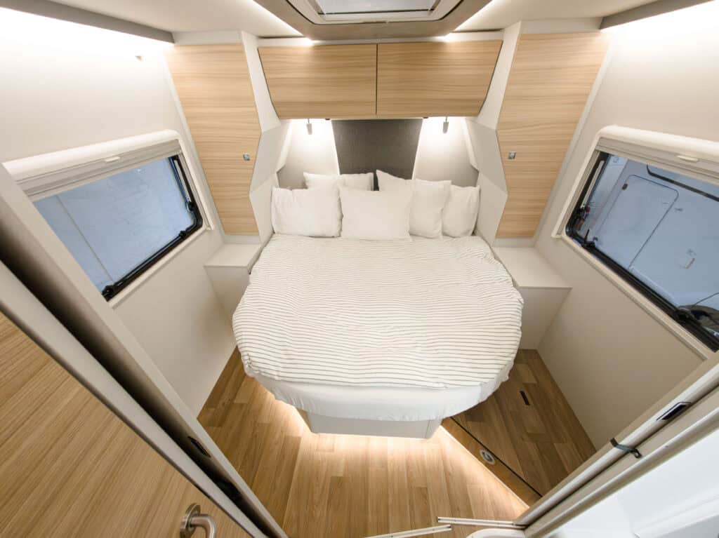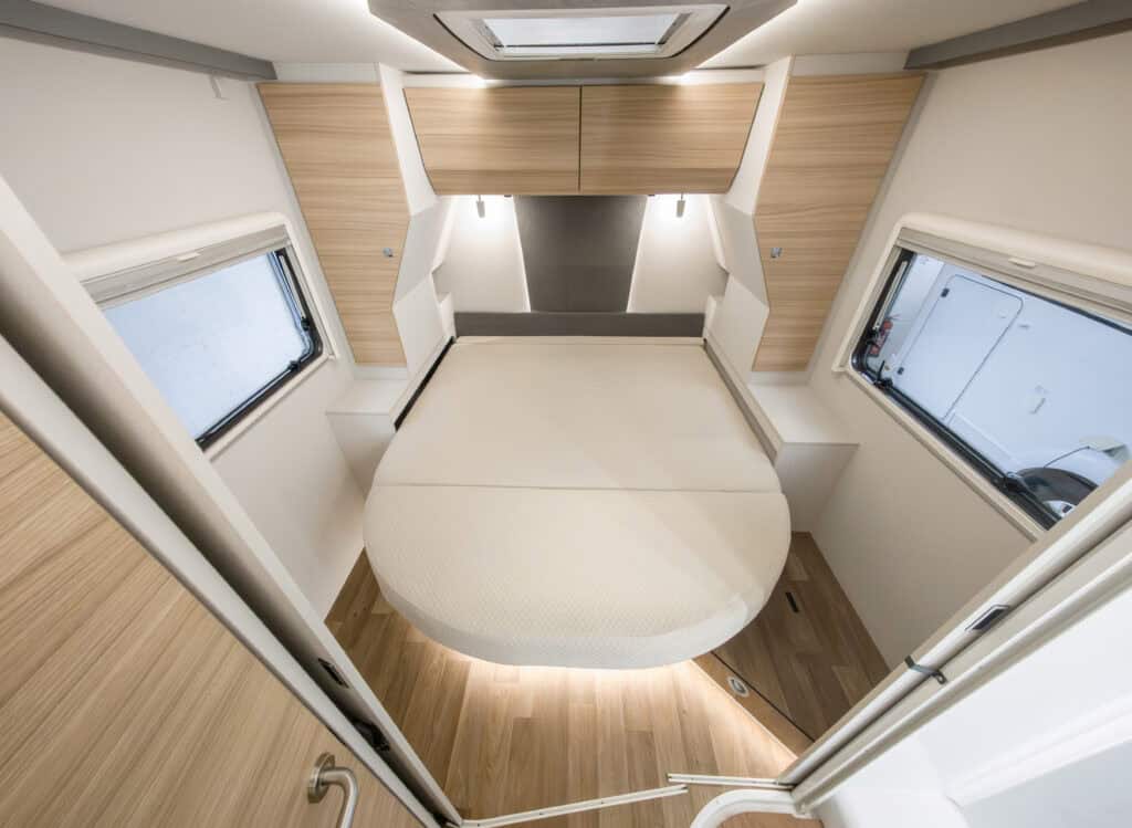 Ruime 2-persoons camper met Queensbed, grote dakramen, douche, toilet, keuken, luifel, fietsenrek en een grote berging. Als optie kan de zithoek tot derde bed worden omgebouwd.