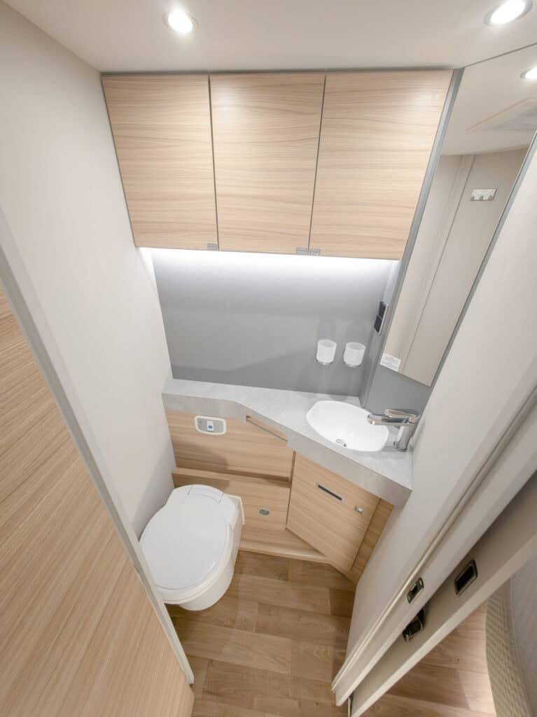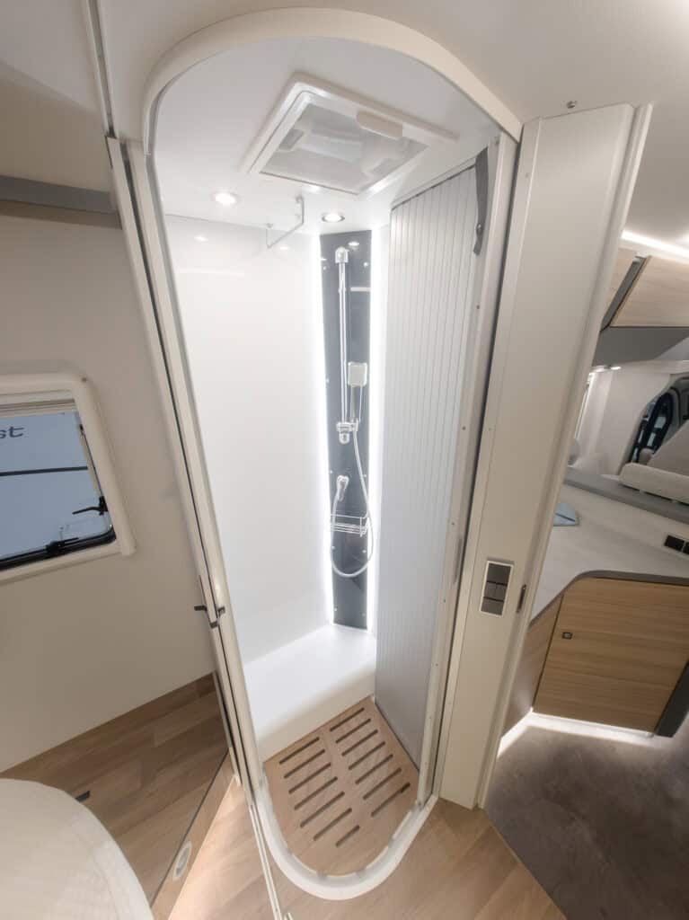 | In hoogte verstelbare douchekraan met vergrendeling | Thetford cassettetoilet met elektrische pomp en draaibare zitting |