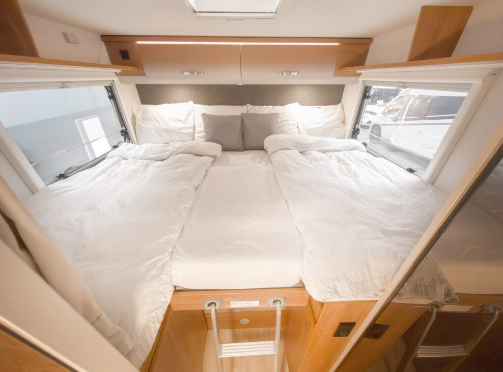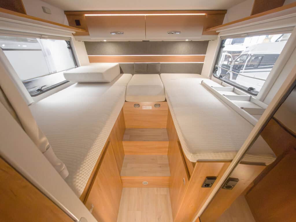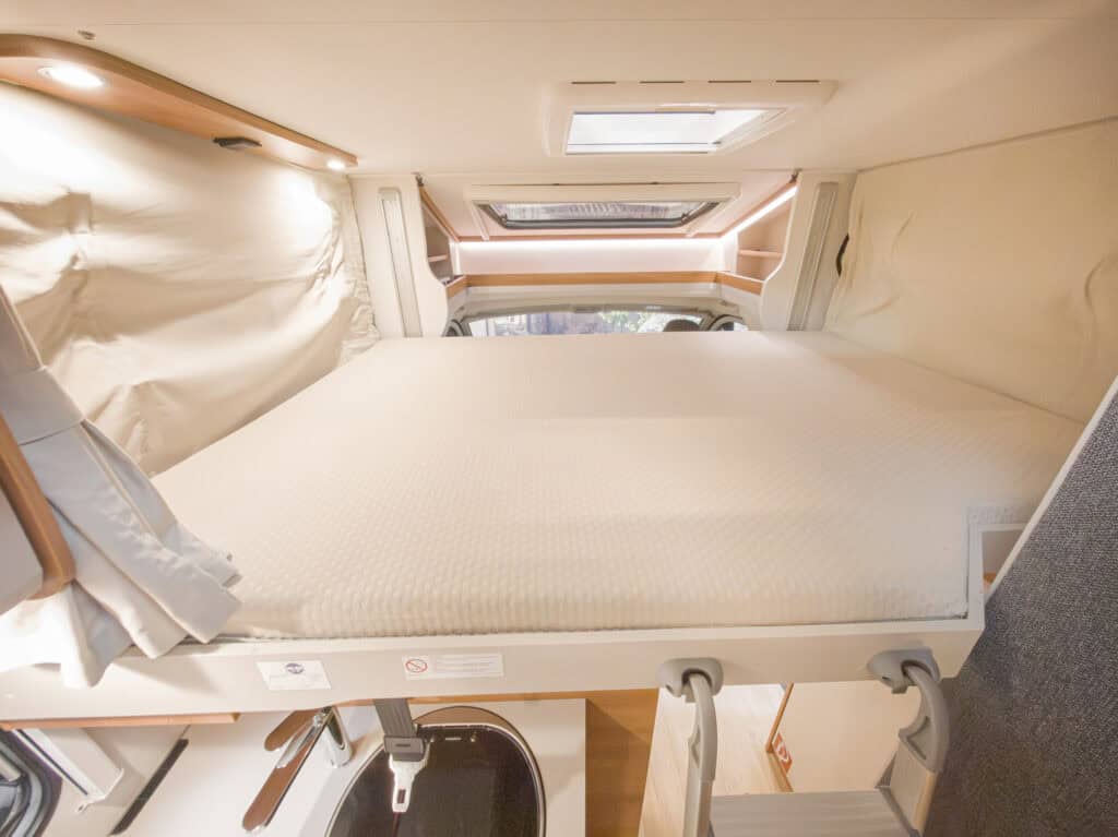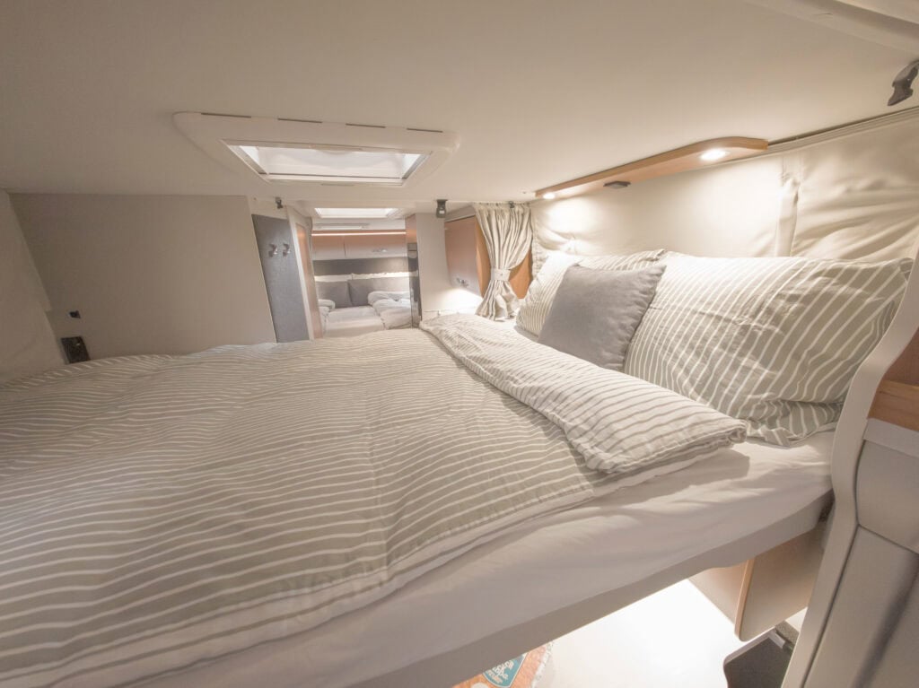 Ruime 4-persoons camper met enkele bedden, hefbed, douche, toilet, keuken, luifel, fietsenrek en een grote berging.