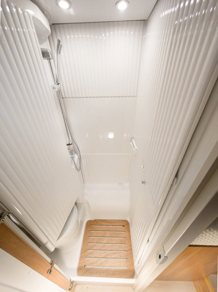 | Vaste douchewanden en waterdichte kunststof zijwanden in de aparte doucheruimte | Kastjes, opbergvakken, handdoekhaakjes en grote spiegel |