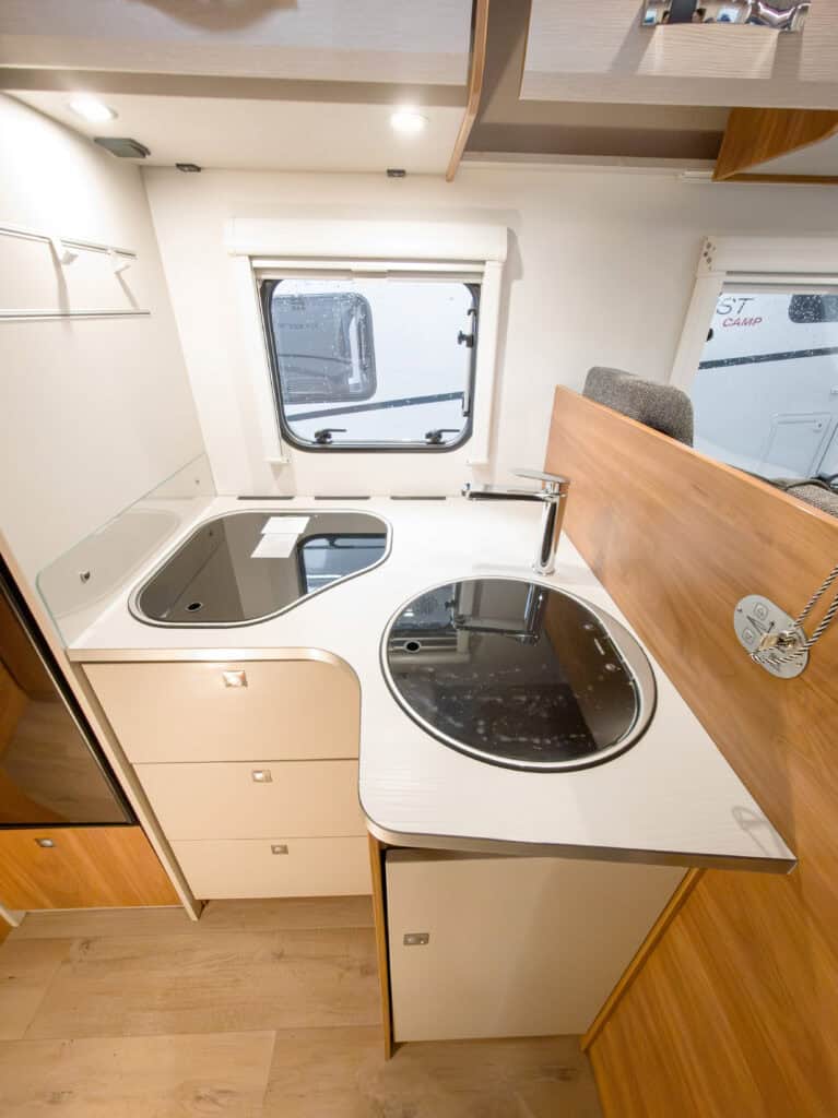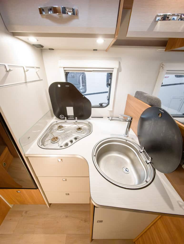 | Dethleffs Gourmet keukencenter met 3-pits fornuis en royale werkruimte | Spoelbak en fornuis van hoogwaardig RVS |