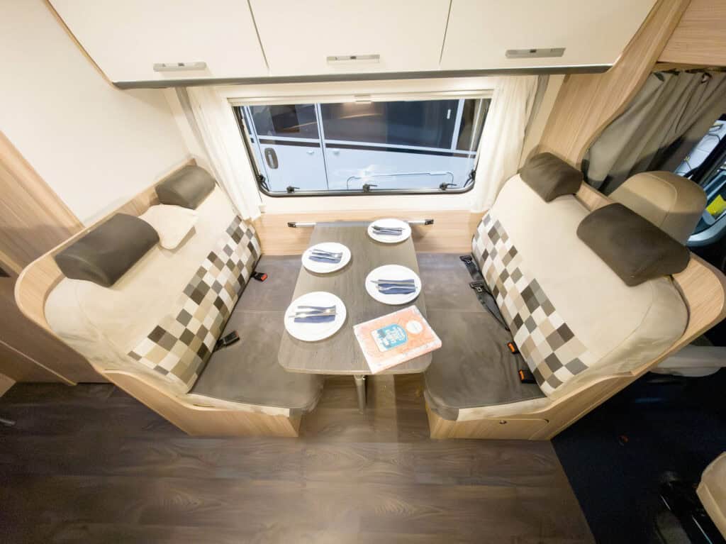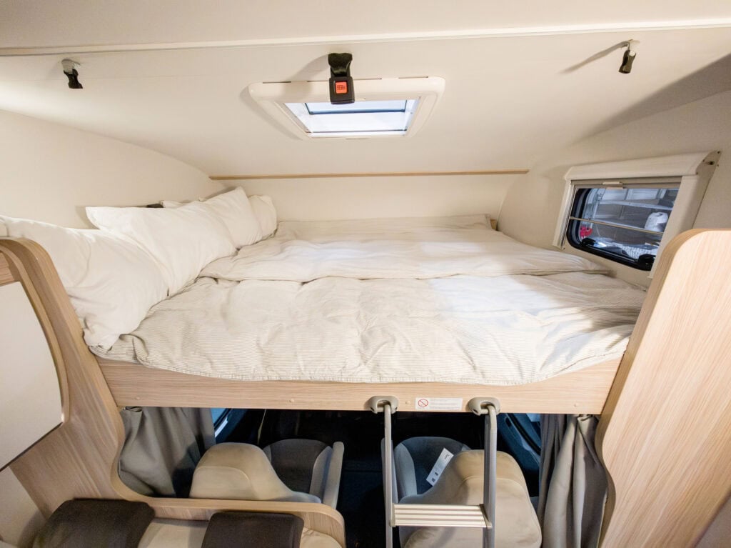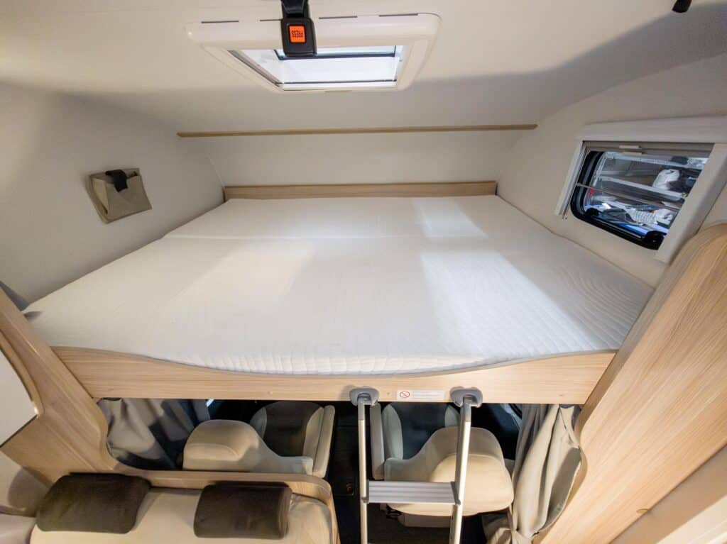 | Opklapbaar alkoofbed voor betere toegang van en naar cabine | Hoogwaardige koudschuimmatrassen in vaste bedden achterin |