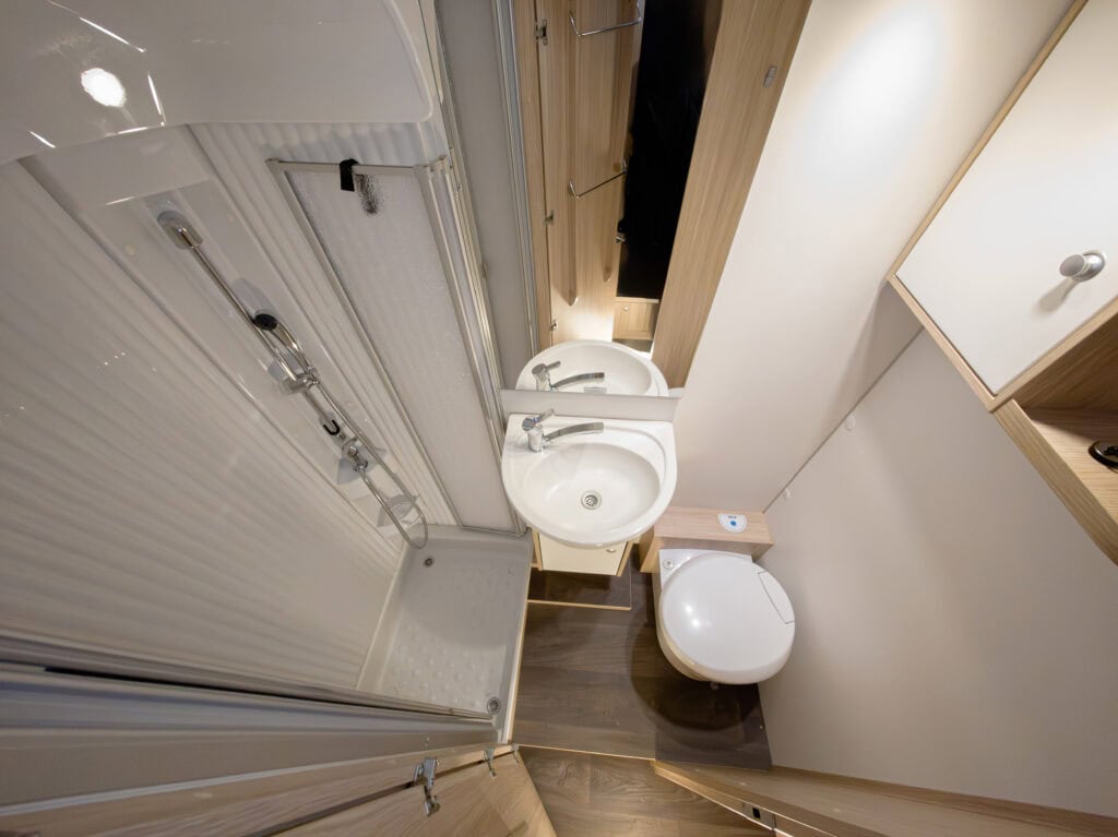 | In hoogte verstelbare douchekraan | Thetford cassettetoilet met elektrische pomp en draaibare zitting |