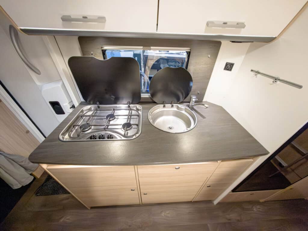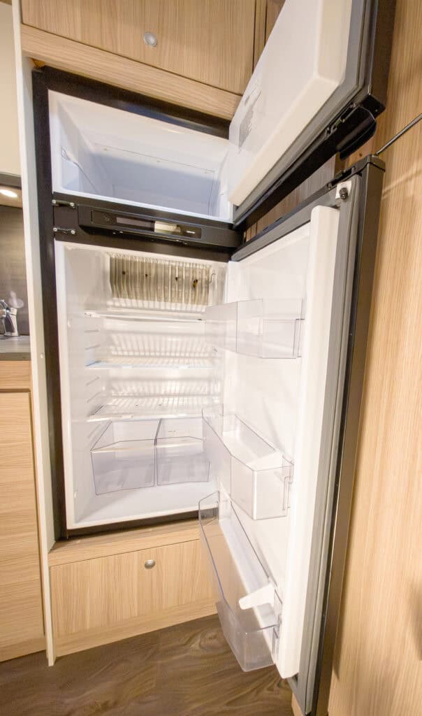| Thetford 3-pits gasfornuis met geïntegreerde vlambescherming en glazen afdekking | Thetford koelkast 167 L met apart vriesvak 29 L |
