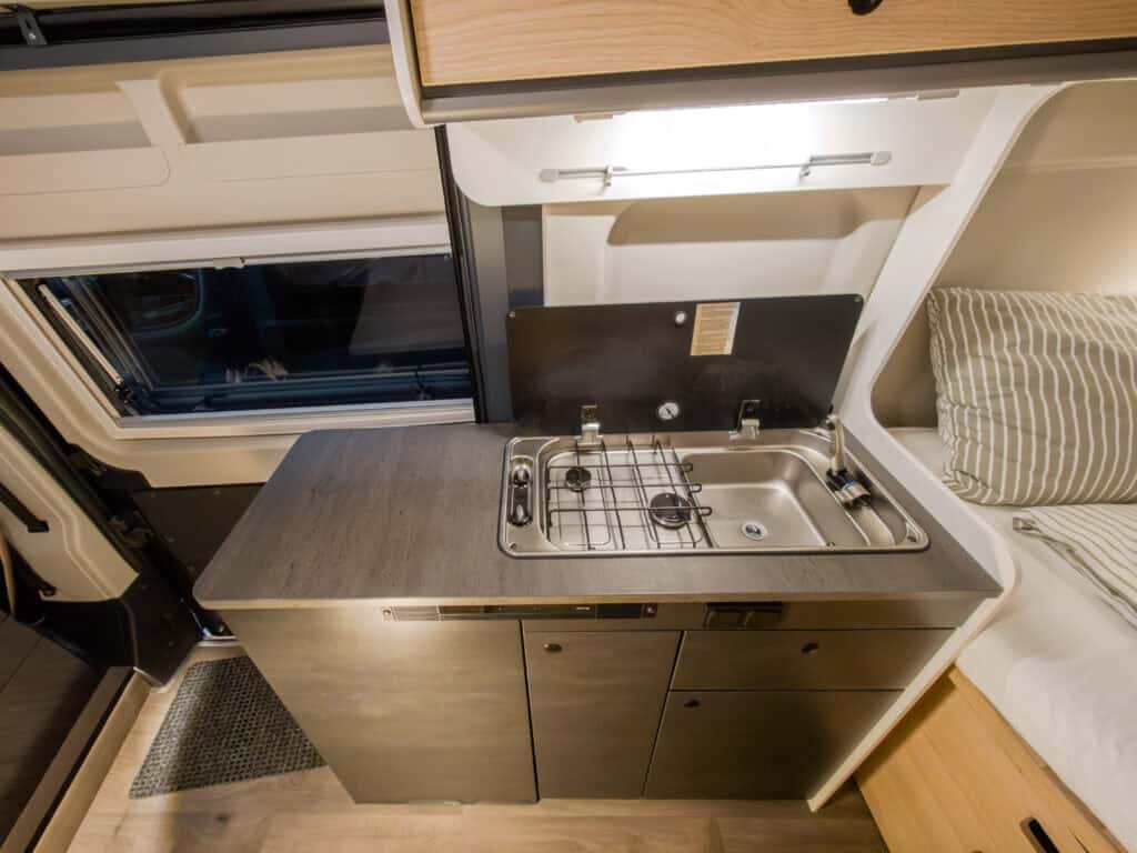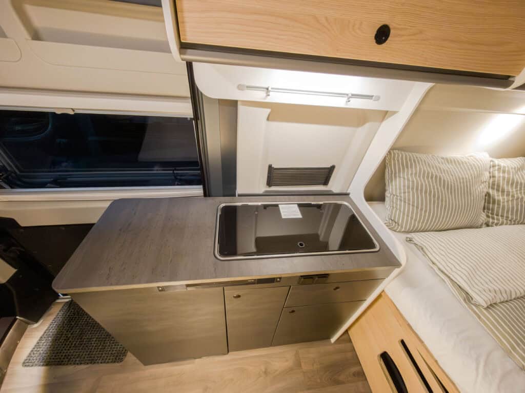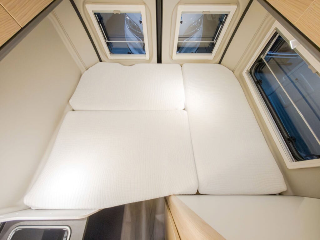 2-persoons buscamper met enkele bedden, lage instap, douche, toilet, keuken en luifel. Deze camper wordt geleverd met een fietsenrek op de achterkant. Trekhaak is optioneel en zit er niet standaard bij.
