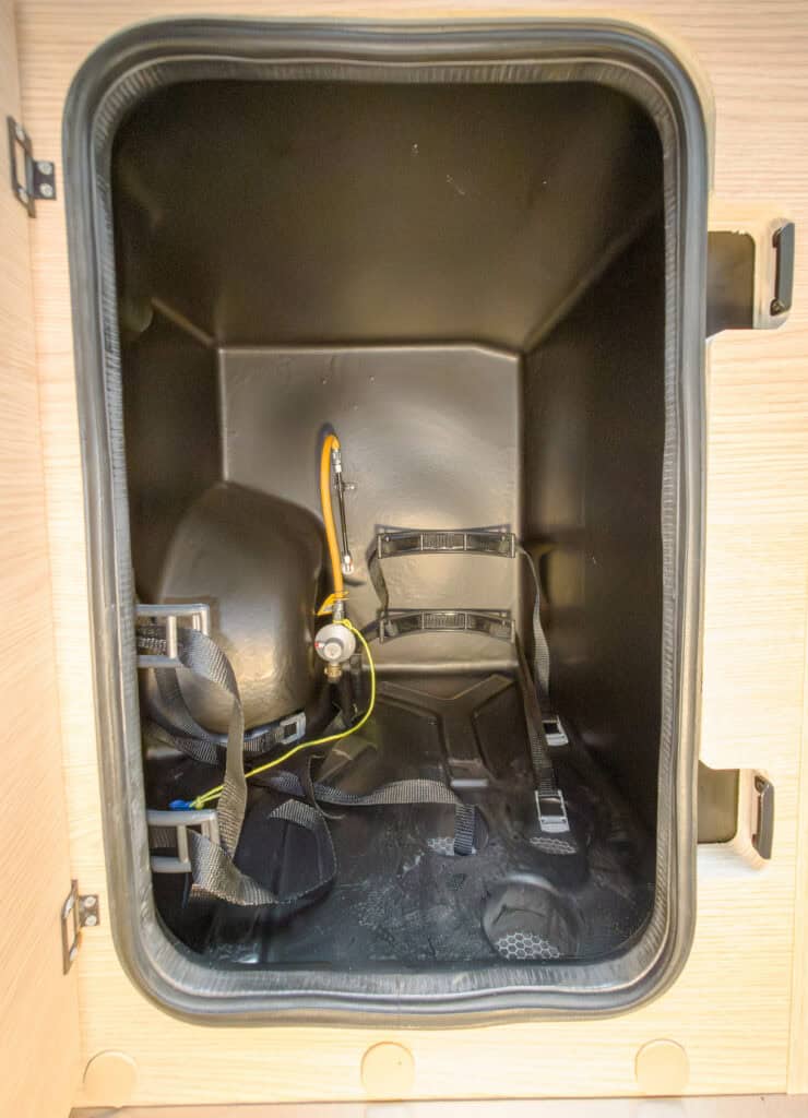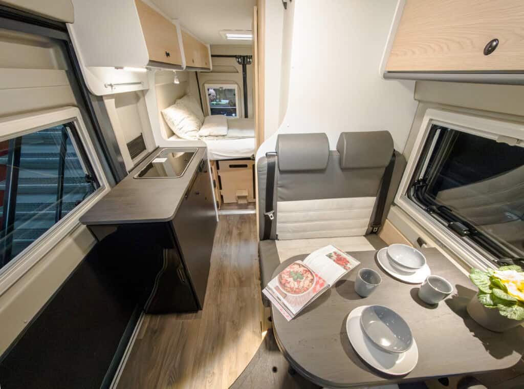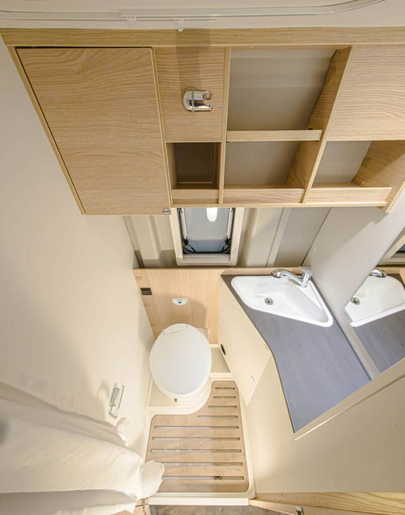 2-persoons buscamper met enkele bedden, lage instap, douche, toilet, keuken en luifel. Deze camper wordt geleverd met een fietsenrek op de achterkant. Trekhaak is optioneel en zit er niet standaard bij.