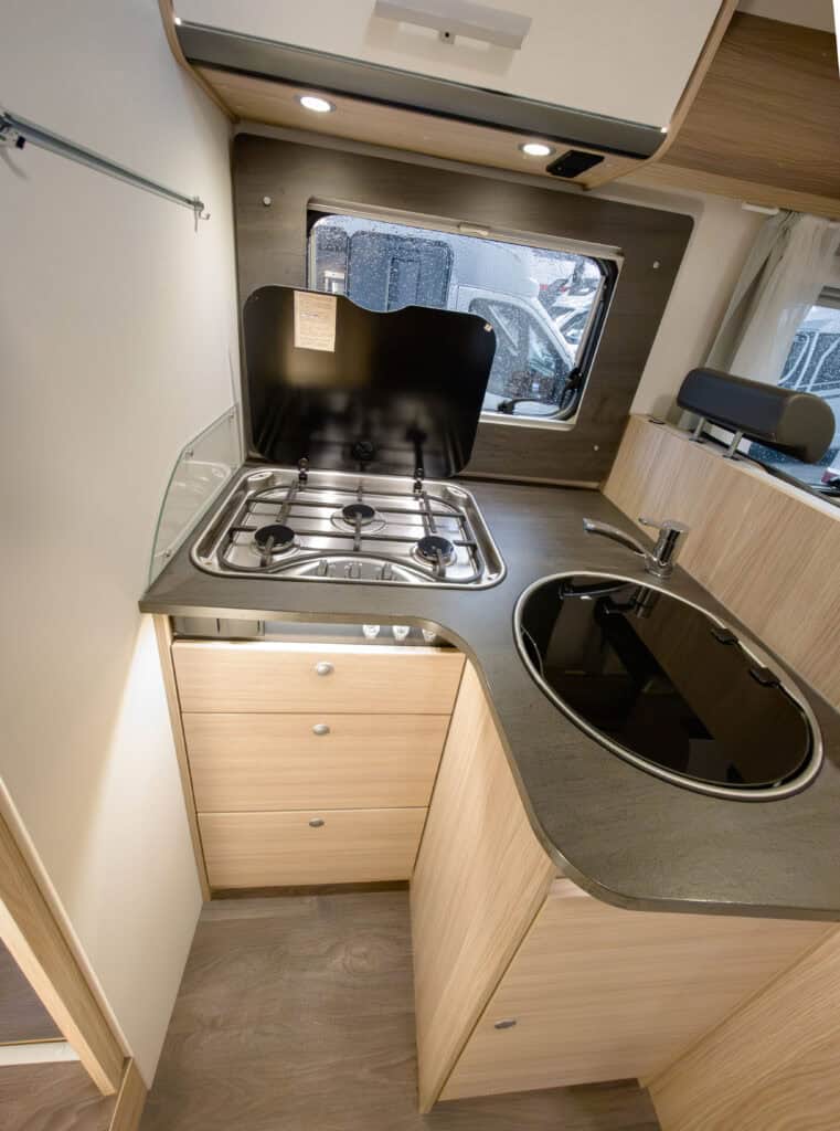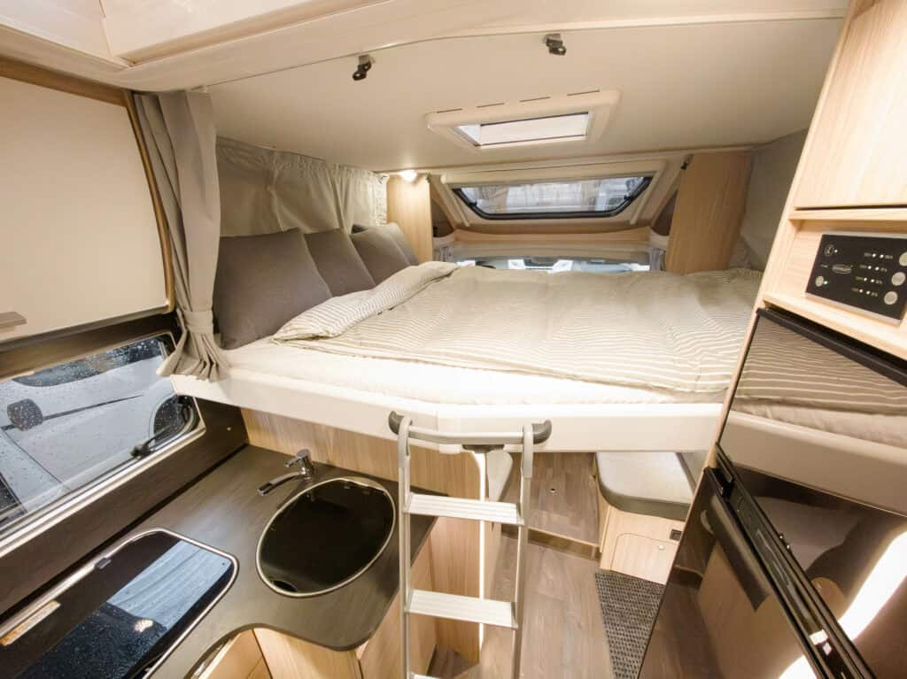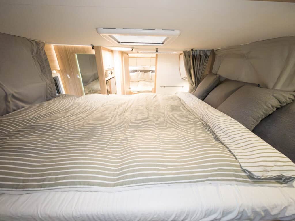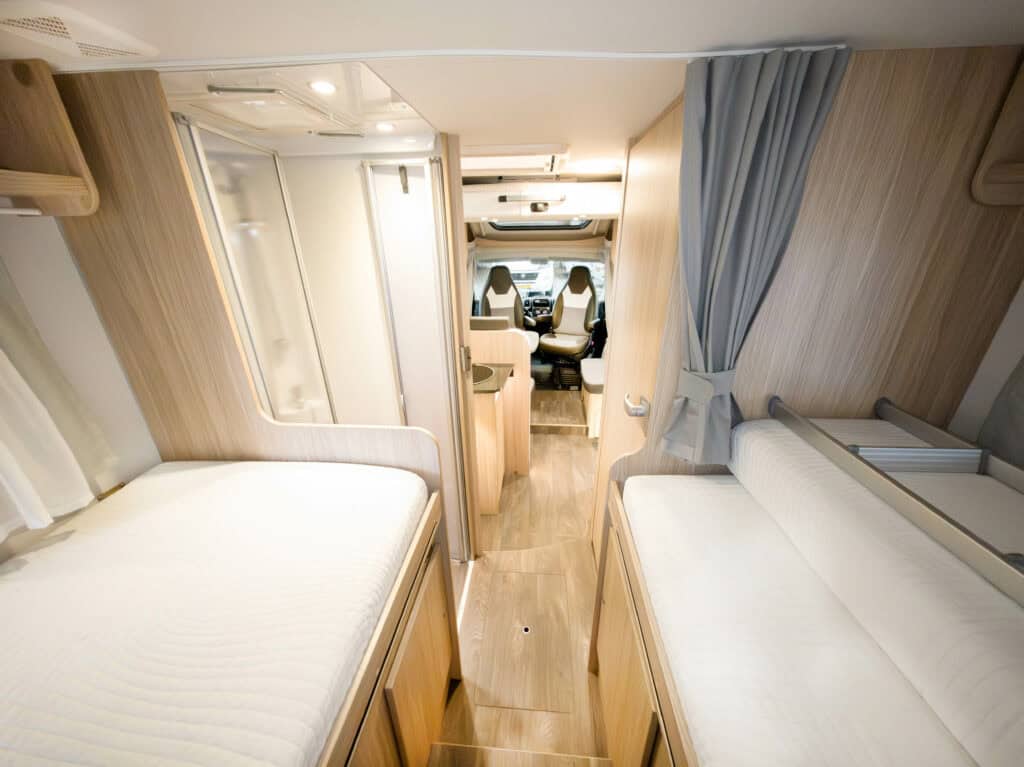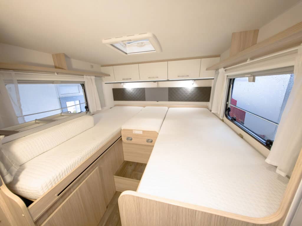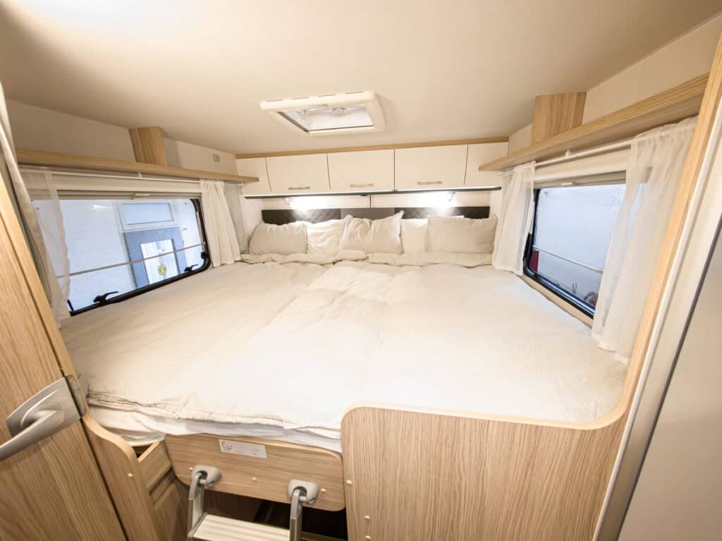 Ruime 4-persoons camper met enkele bedden, hefbed, gescheiden douche en toilet, keuken, luifel, fietsenrek en een grote berging.