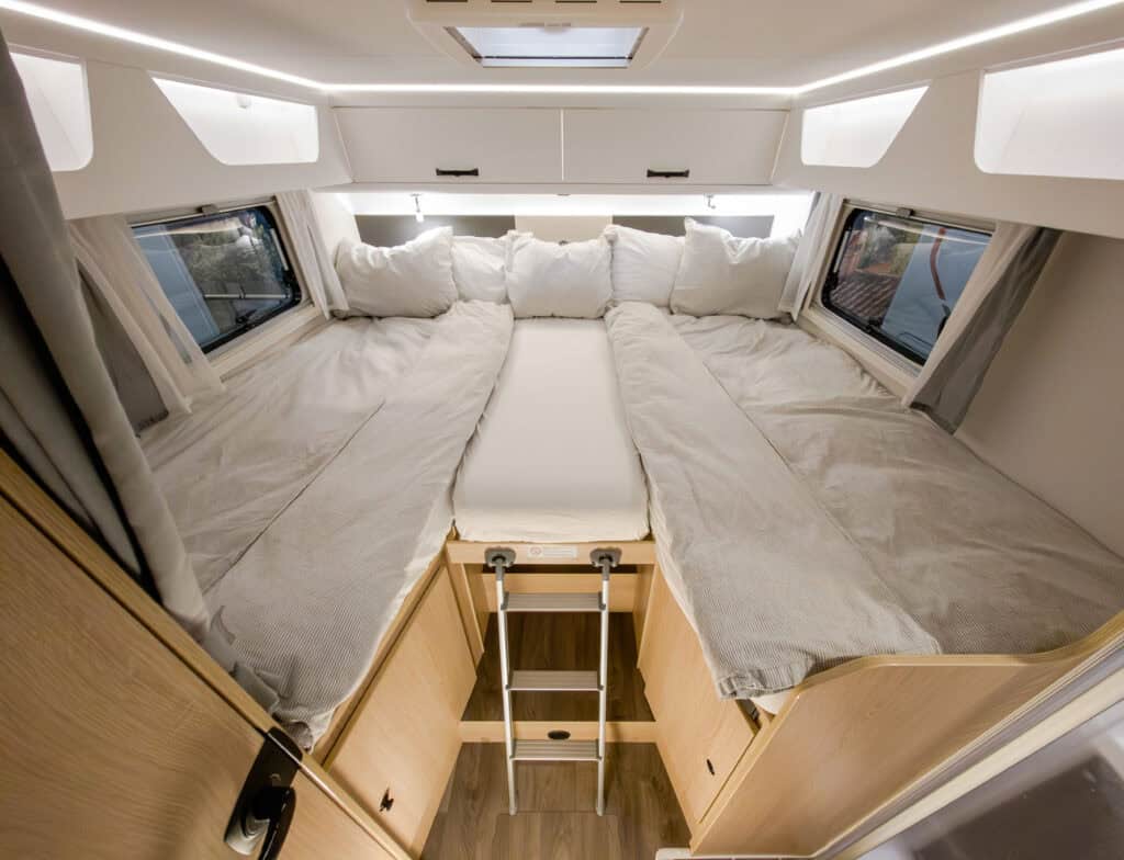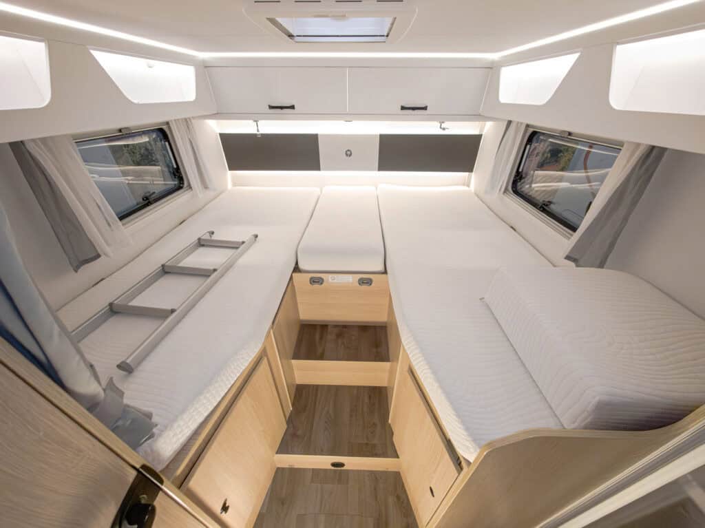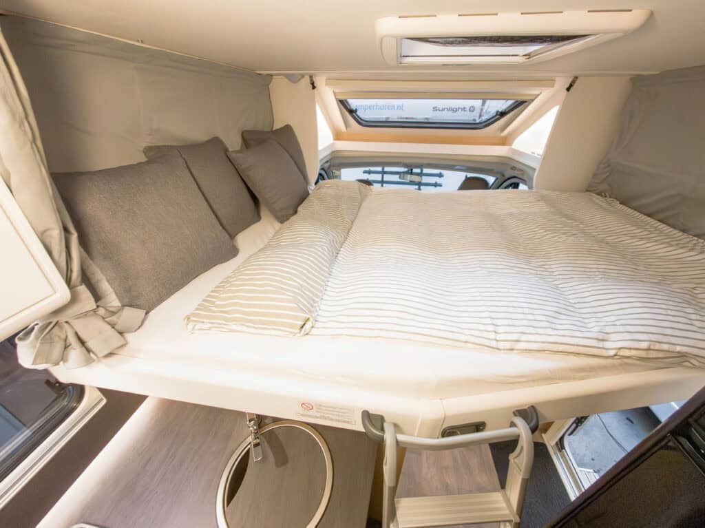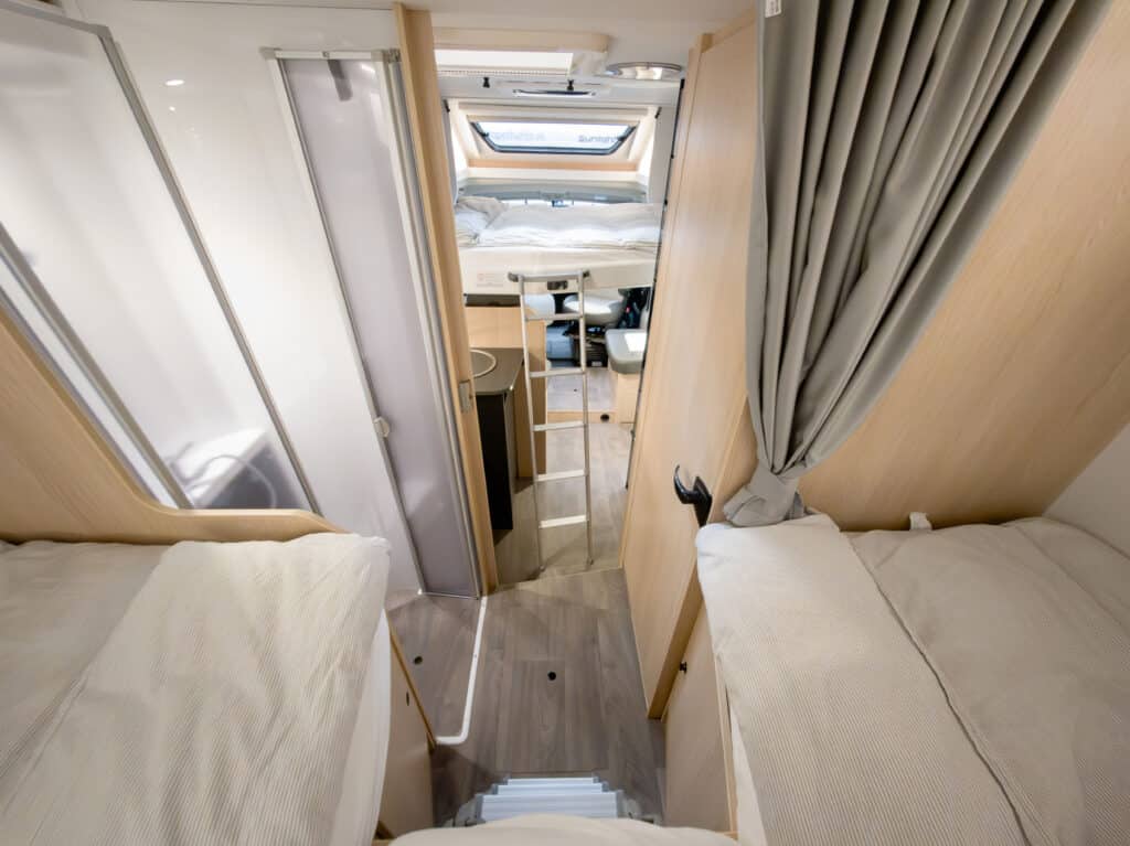 Ruime 4-persoons camper met enkele bedden, hefbed, douche, toilet, keuken, luifel, fietsenrek en een grote berging.