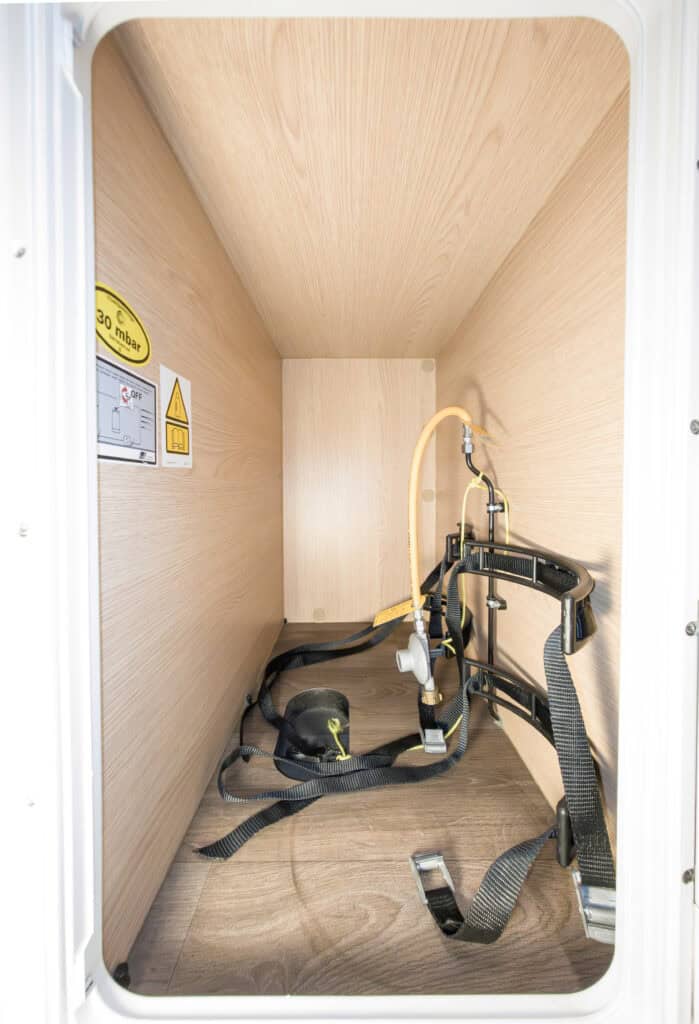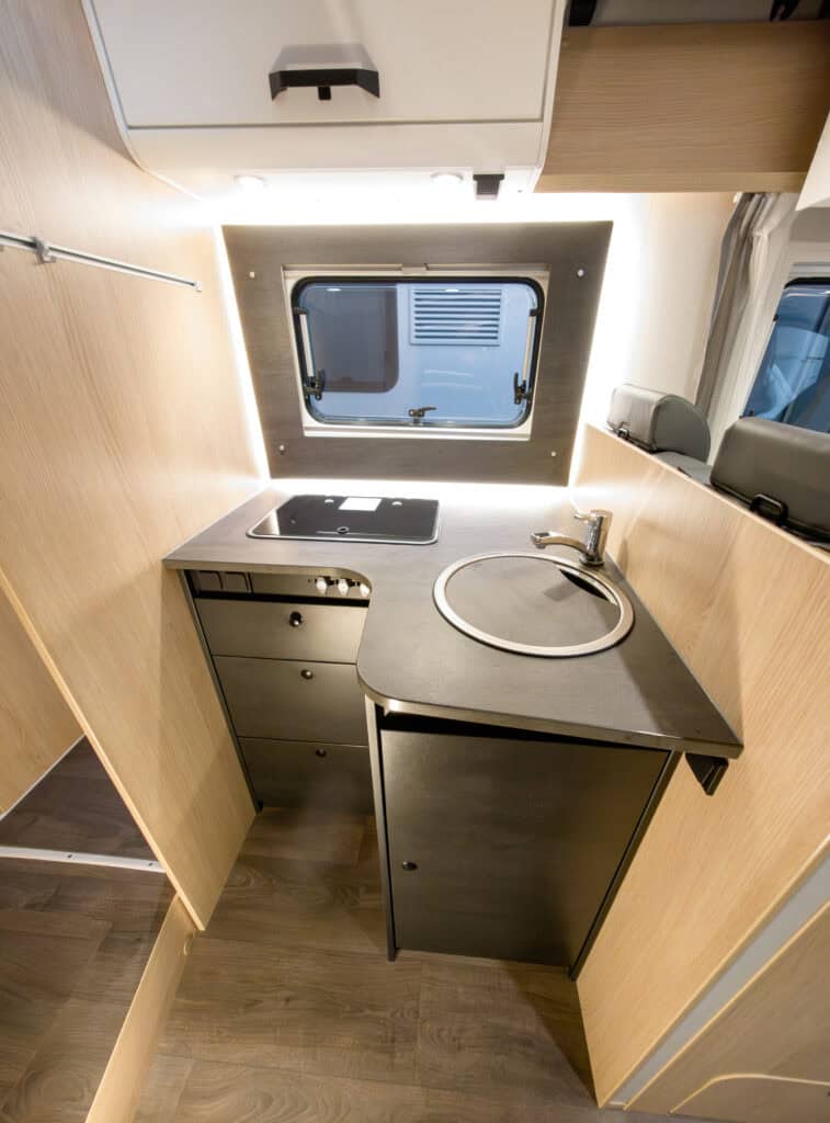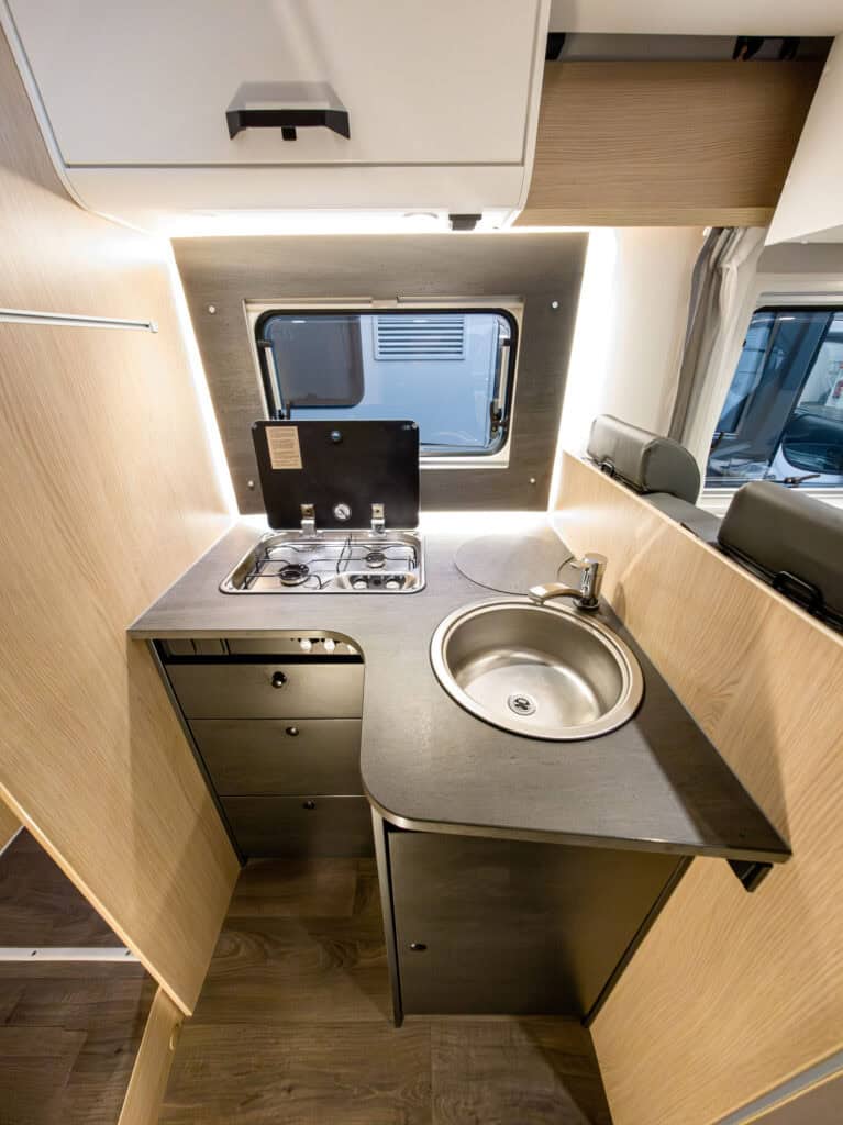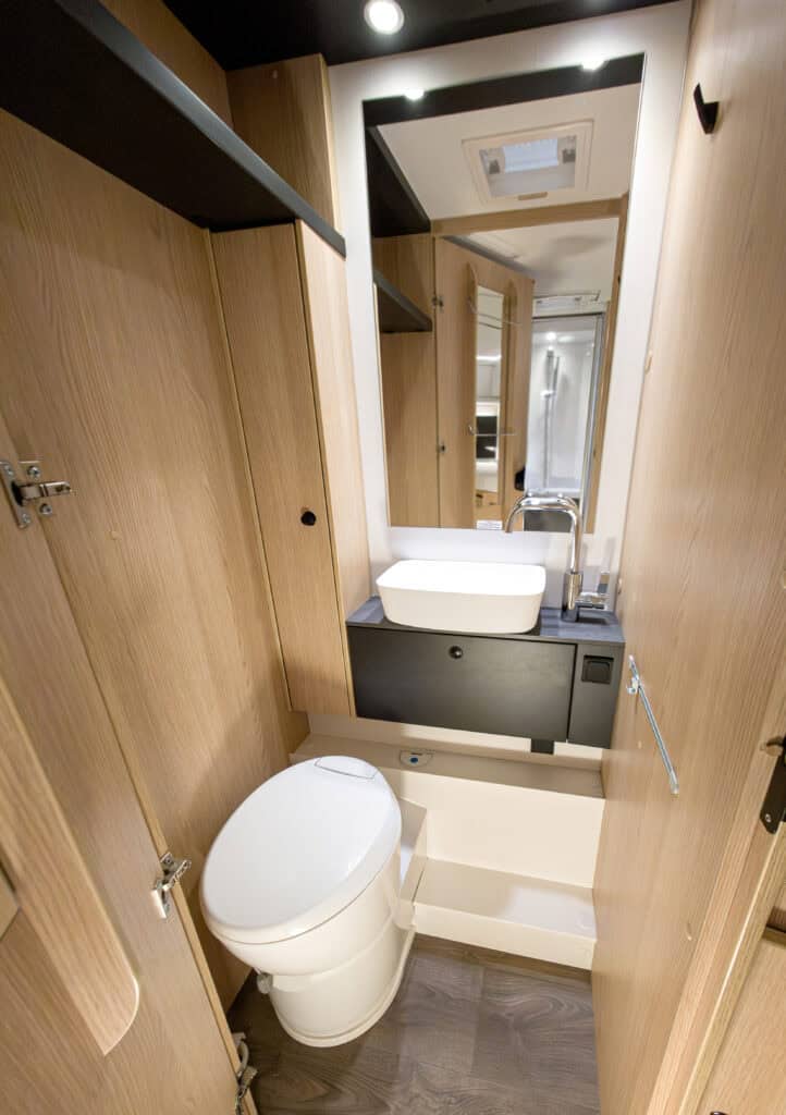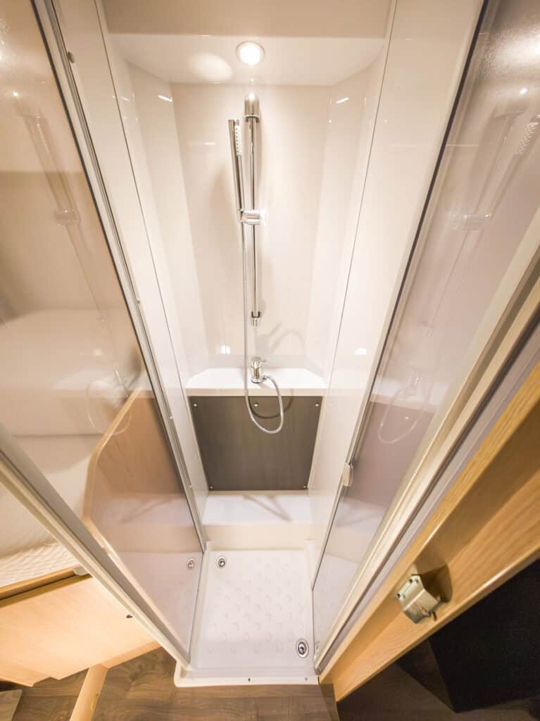 Ruime 4-persoons camper met enkele bedden, hefbed, douche, toilet, keuken, luifel, fietsenrek en een grote berging.